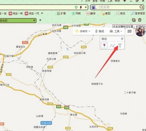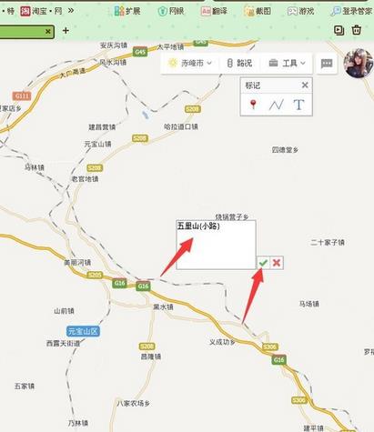 6、其實,我們不光可以利用百度地圖標記位置,更能對已有的位置進行詳細備注,如若需要開啟此功能的話,可以在標記的工具中,選擇“T”形狀的圖標,如下圖所示的位置。根據需要備注好信息后,只要點擊一下那個“對號”就行了。