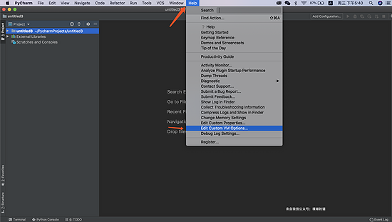1)進入到項目界面后,點擊Pycharm最上面的菜單欄中的 “Help” -> “Edit Custom VM Options …”。