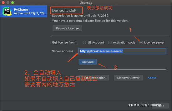 2)選擇最后一種License server激活方式,地址填入: http://jetbrains-license-server (應該會自動填上),或者點擊按鈕:”Discover Server”來自動填充地址,完成激活。