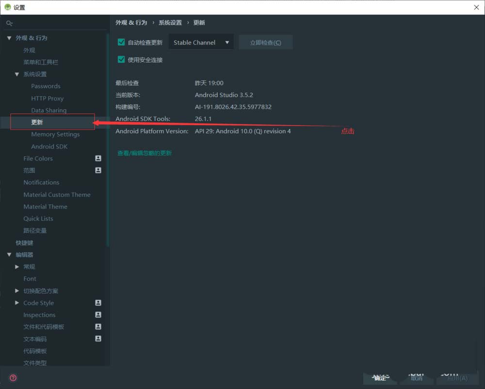 打開Android Studio。打開左上角“文件”-“設(shè)置”。點擊“外觀&行為”。點擊“系統(tǒng)設(shè)置”。點擊“更新”。取消勾選“自動檢查更新”,點擊確定。