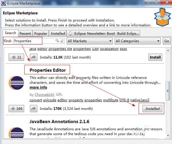 2、在Search標簽頁中,輸入“Properties”關鍵字進行匹配查找,會發現有一款叫“Properties Editor”的插件,點擊“Install”按鈕進行安裝。