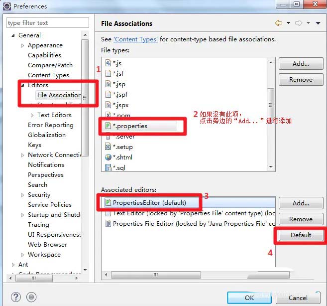 7、配置“*.properties”文件默認使用剛剛安裝的插件PropertiesEditor進行關聯打開。點擊Eclipse菜單Window > Preferences > General > Editors > File Associations,在“File Associations”頁面,配置文件類型為“*.properties”的文件的關聯編輯器為PropertiesEditor