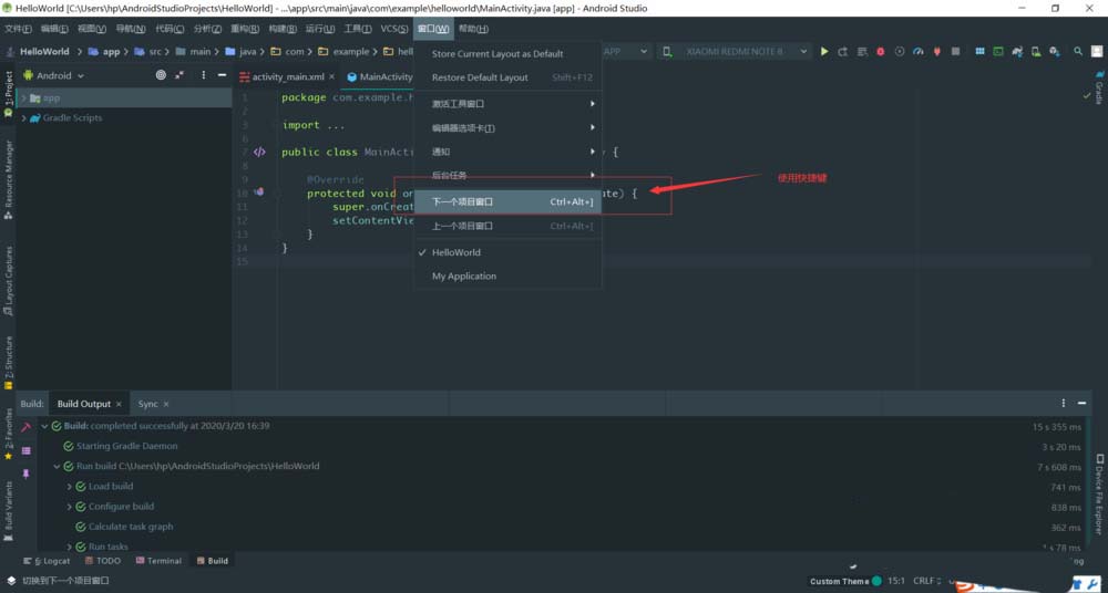 打開Android Studio;開一個項目;點擊“窗口”,最下一行點擊項目,即可切換;使用快捷鍵“ctrl + alt +[”和“ctrl + alt + ]”快速切換。