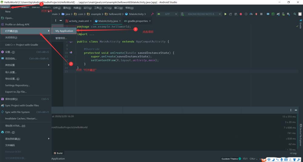 2、我們這里默認打開了上次編輯的項目“HelloWorld”,我們再開一個項目:點擊頂部菜單欄“文件”-“打開最近”-“My Application”。