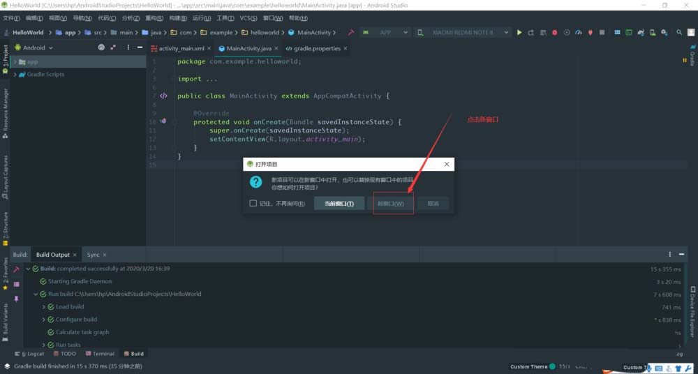3、彈出的“打開項目”對話框中提示“是否在新窗口打開”,我們點擊“新窗口”,就在新窗口打開了。