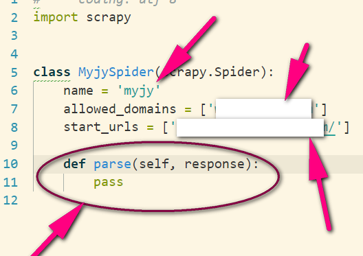 9、如圖,里面有自動(dòng)生成的內(nèi)容,name不要改,parse函數(shù)也不要改,不然報(bào)錯(cuò)。在parse里面寫解析規(guī)則即可。