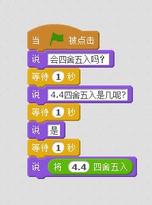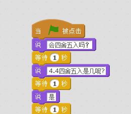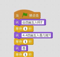 1、小貓教你怎么四舍五入。綠旗拖入腳本區。說4.4四舍五入是幾,等待1秒。