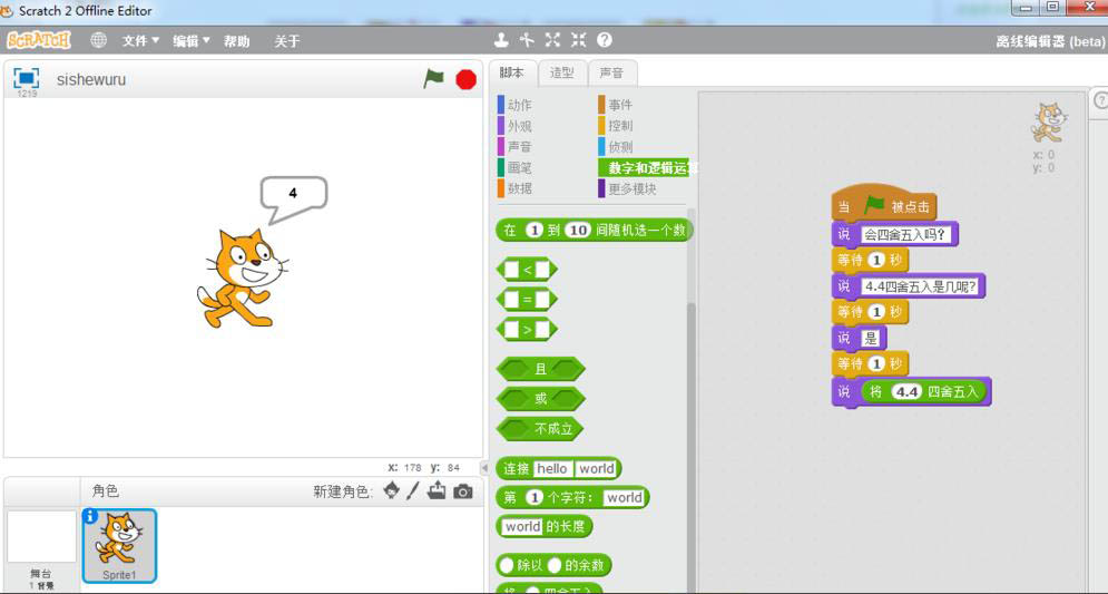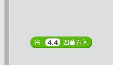 2、scratch帶有能自動四舍五入的積木。將四舍五入的積木拖入腳本區。輸入4.4,驗證效果。結果為4。