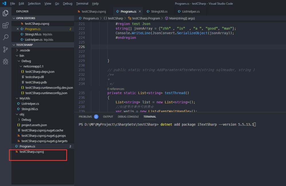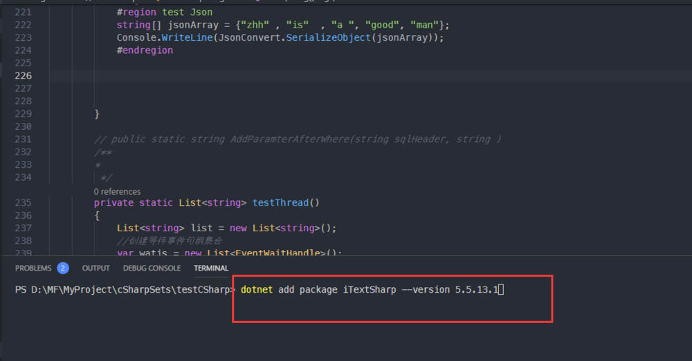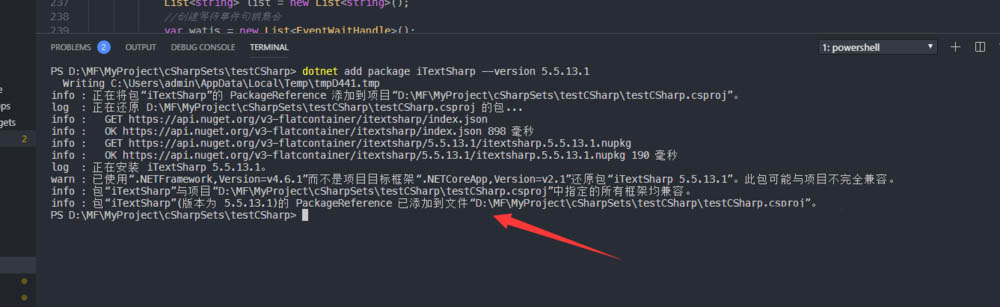 2、在命令行中,輸入命令: dotnet add package iTextSharp --version 5.5.13.1