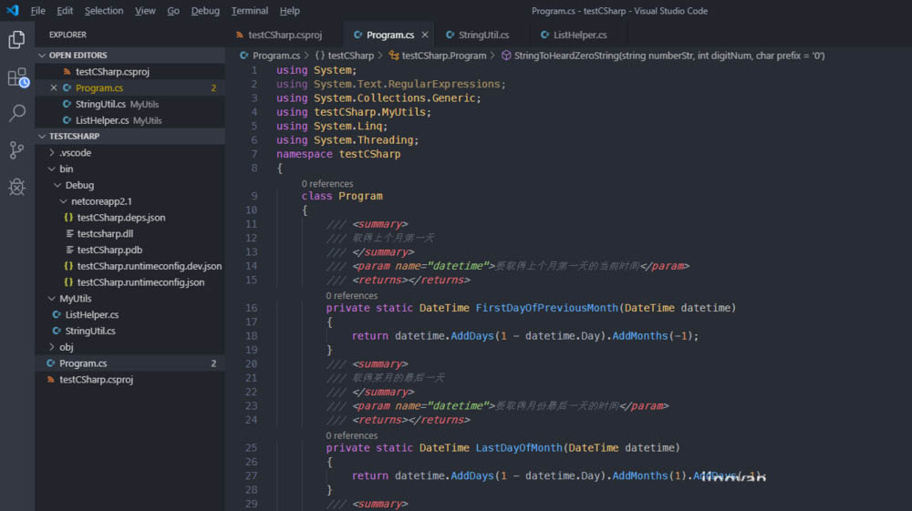 1、vs code中配置好c#項目后,打開如圖所示的Program.cs文件