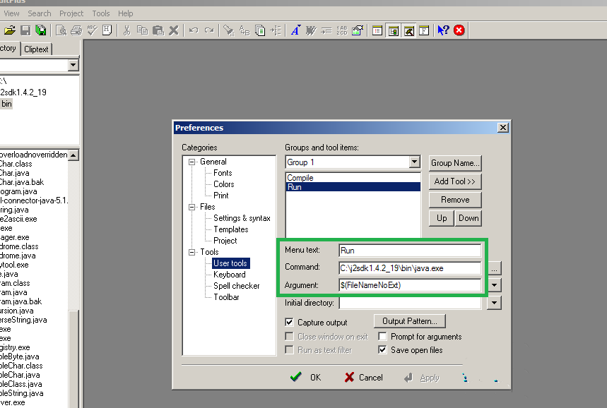 6、在menutext文本框輸入run,command文本框輸入java.exe文件的路徑,Argument文本框輸入$(FileNameNoExt),點擊ok