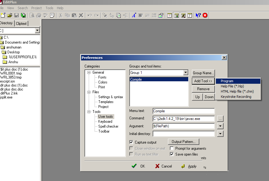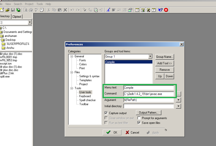 3、在menutext文本框輸入compile,command文本框輸入javac.exe文件的路徑,點擊ok