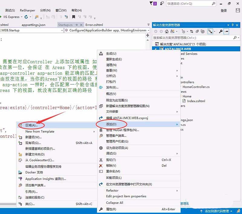 8、重啟完電腦后,我們再次打開VS 2017,在項目中右鍵就可以發現“區域Area”選項了,如下圖所示: