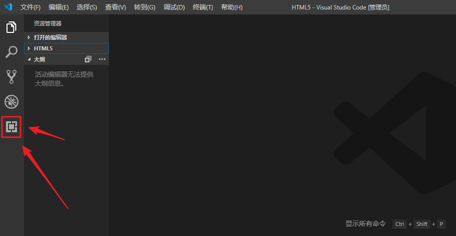 3、我們需要點(diǎn)擊VS Code軟件左邊的“擴(kuò)展”,或者同時(shí)按住鍵盤上的Ctrl+shift+I鍵進(jìn)入“擴(kuò)展”界面