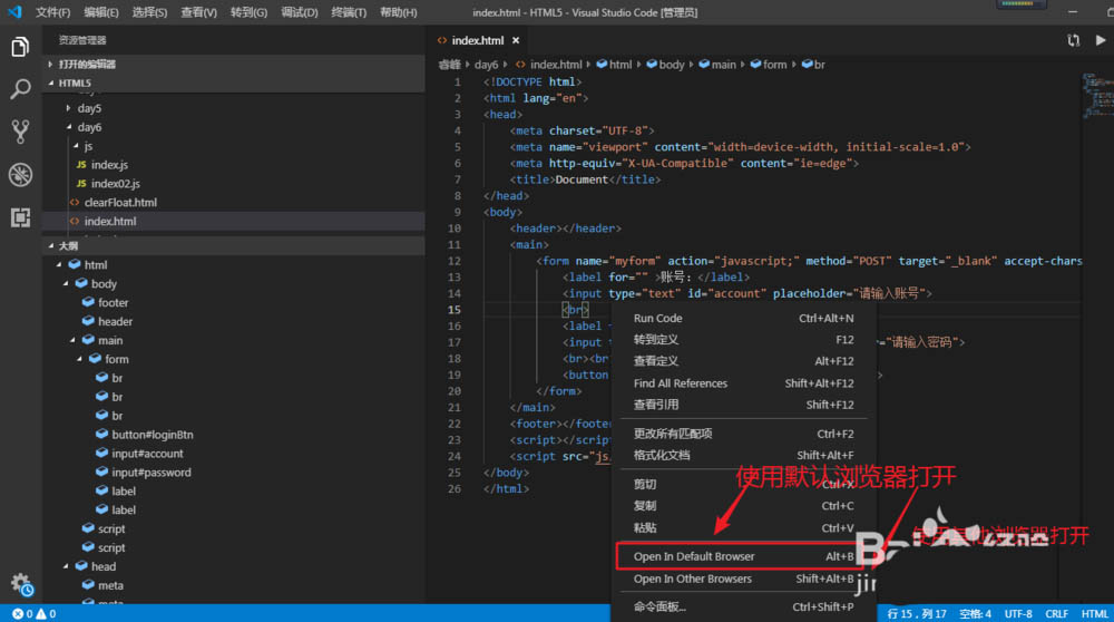 5、安裝之后,我們就可以進(jìn)行我們的HTML文件的運(yùn)行了。安裝完成之后,我們?cè)俜祷氐轿覀兊腍TML界面,然后鼠標(biāo)右鍵,找到下圖標(biāo)識(shí)的選項(xiàng)進(jìn)行運(yùn)行