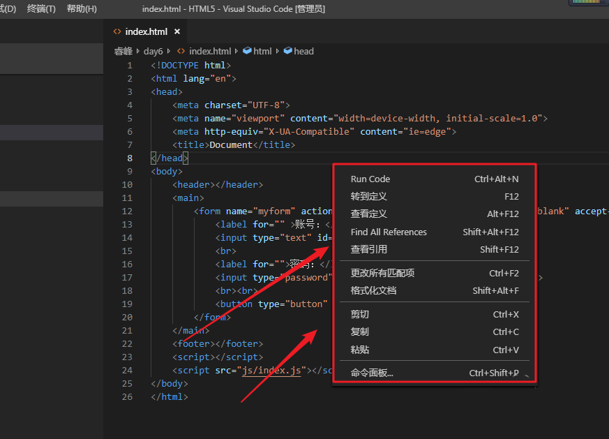 2、這時(shí)候我們寫好HTML內(nèi)容之后,鼠標(biāo)右鍵,發(fā)現(xiàn)沒有運(yùn)行HTML文件的按鈕,那么我們?cè)撊绾芜\(yùn)行HTML文件呢?