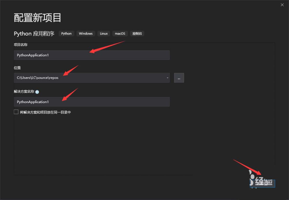 7、進(jìn)入到項(xiàng)目配置窗口,可以在這里設(shè)置項(xiàng)目的名稱和位置,以及解決方案的名稱,點(diǎn)擊創(chuàng)建就可以了。