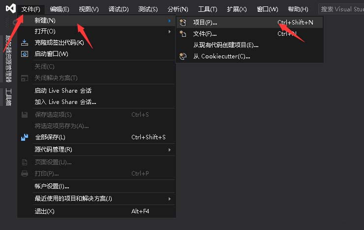 4、在菜單欄中選擇文件菜單,選擇新建,點(diǎn)擊項(xiàng)目,來新建項(xiàng)目。