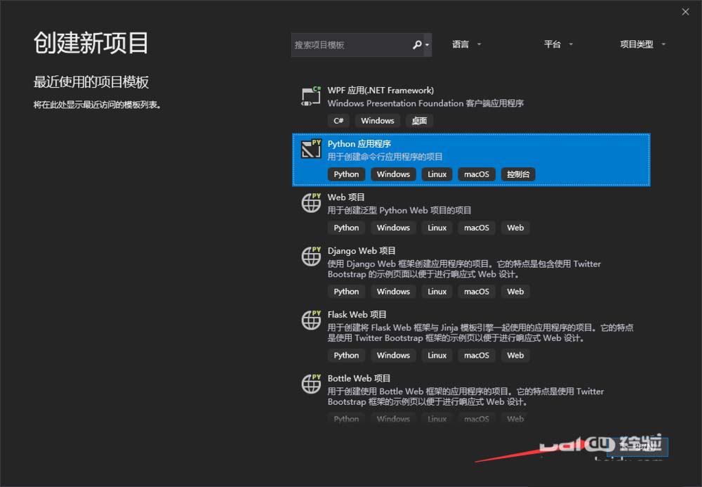 6、在這里,我們選擇python項(xiàng)目,然后點(diǎn)擊箭頭送指的下一步選項(xiàng)。