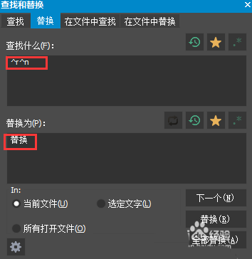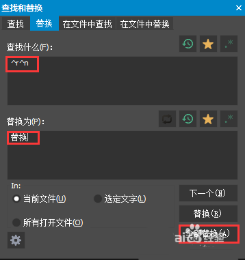 4、彈出查找和替換窗口,在查找什么中輸入^r^n,在替換為中輸入替換