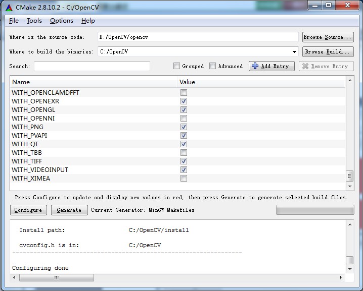 打開CMake,使用CMake編譯OpenCV。配置源碼路徑與生成的目標路徑