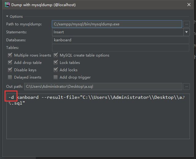 導(dǎo)出結(jié)構(gòu)與上面基本一致,只是在下面命令行的表名前面,添加一個(gè)-d記住,后面要添加一個(gè)空格,如下圖
