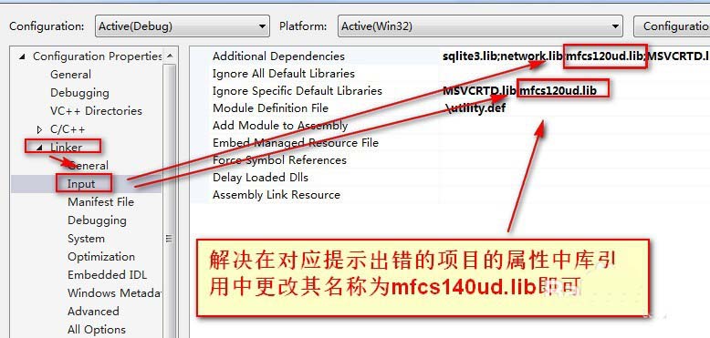 2、解決在對應(yīng)提示出錯的項目的屬性中庫(Properties->Linker->Input->Additional Dependencies)引用中更改其名稱為mfcs140ud.lib即可。