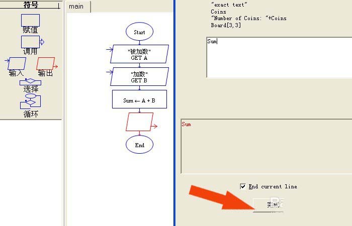 5、左鍵單擊【賦值】圖形,并拖動到流程圖加數的后面,作為加法運算。然后,在畫流程圖的工具窗口中,鼠標左鍵單擊【賦值】圖形,并拖動到流程圖加數的后面,作為加法運算。雙擊【賦值】圖形,輸入加法運算式,并單擊【完成】按鈕,如下圖所示。