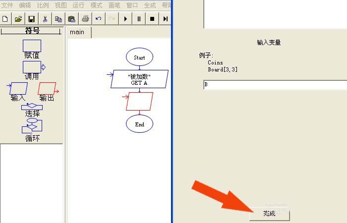 4、單擊【輸入】圖形,并拖動到流程圖中間位置處,作為加數。接著,在畫流程圖的工具窗口中,鼠標單擊【輸入】圖形,并拖動到流程圖開始和結束的中間位置處,雙擊【輸入】圖形,在提示窗口上輸入加數和變量名稱,并單擊【完成】按鈕,如下圖所示。