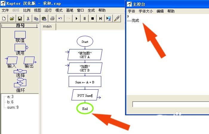 最后,在運行到賦值運算和輸出后,可看到運算結果顯示出來了,在主控臺上也可以看到運算結果,通過口算檢查,運算結果正確。說明求兩數之和的流程圖畫的是正確的,如下圖所示。通過設計簡單的算法流程圖,就可以熟悉使用Raptor程序來畫流程圖了。