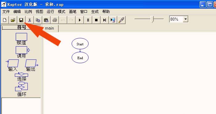 2、在運行的Raptor界面上,單擊【保存】按鈕,并準備流程圖設計。接著,在運行的Raptor界面上,單擊【保存】按鈕,根據設計的求兩數之和的要求,準備流程圖設計,如下圖所示。