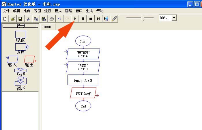 7、流程圖畫好了,可以運行程序,檢查輸出運算結果。然后,流程圖畫好了,可以運行程序,檢查輸出運算結果。鼠標左鍵單擊菜單下的【運行】按鈕,如下圖所示。