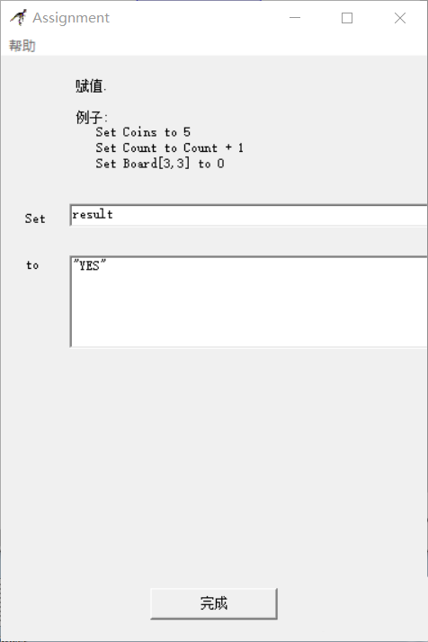 在賦值框1上方輸入 result 下方輸入 "YES"