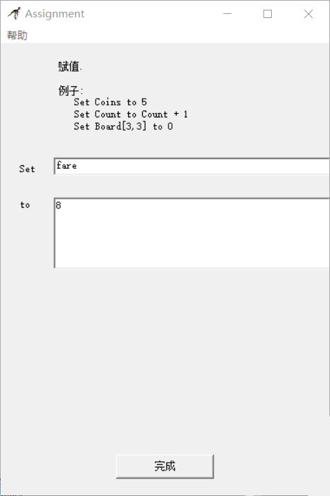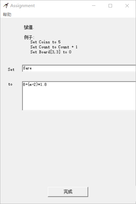 5、雙擊賦值框 在左邊上方輸入fare 下方輸入8,在右邊上方輸入fare 下方輸入8+(m-2)*1.8