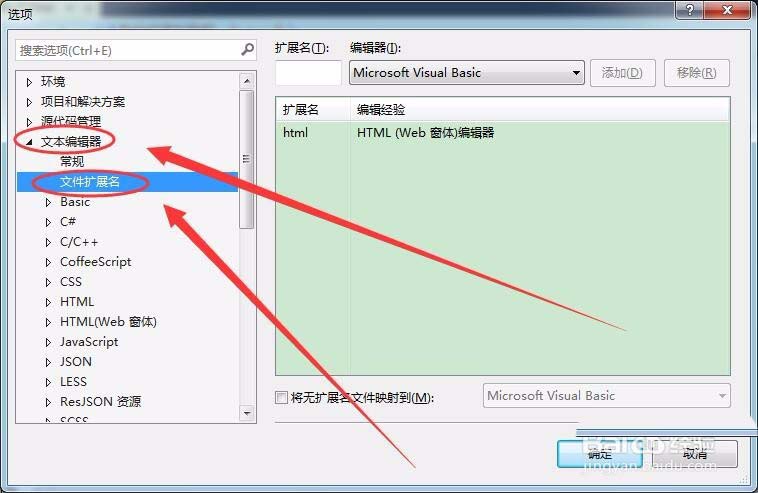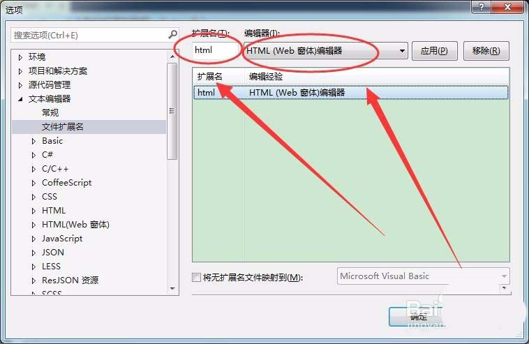 7、擴展名中輸入html,右側選中HTML(WEB窗體)編輯器,添加此項。