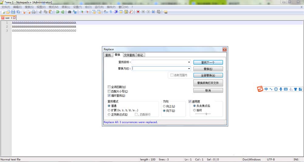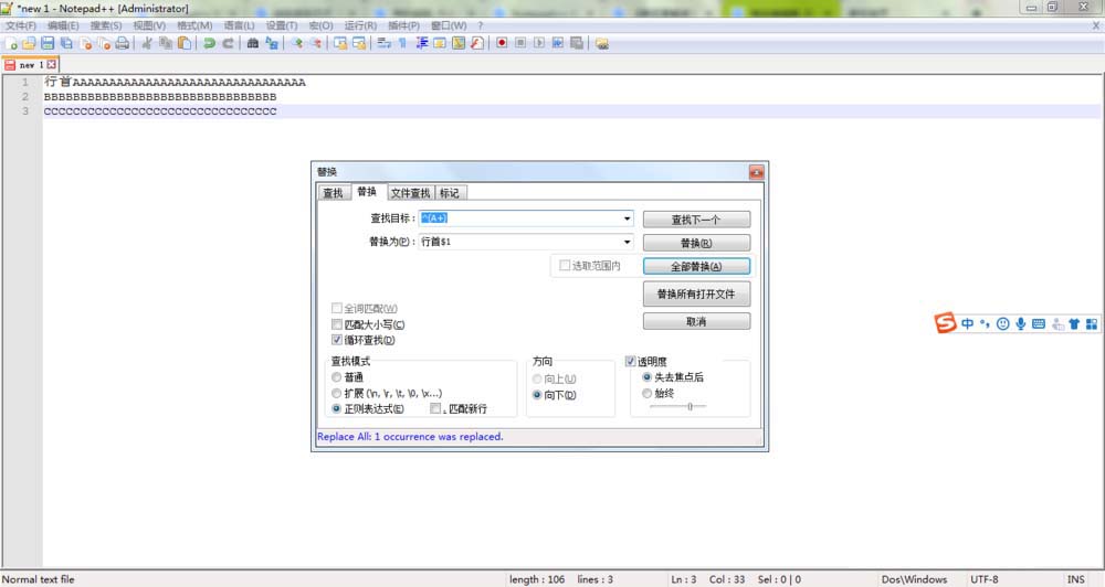 ※1。在替換為輸入框中輸入想要增加的內容,比如“行首$1”。在查找模式中選擇正則表達式。點擊全部替換即可。