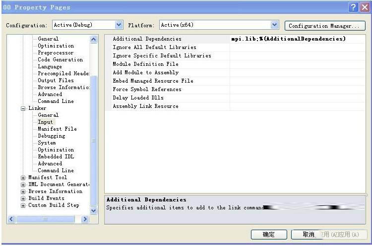 (4)展開左邊Linker,選中其中的Input,在右邊Additional Dependencies加入“mpi.lib;”