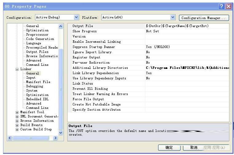 (3)展開左邊Linker,選中其中的General,在右邊Additional Library Directories加入MPICH2安裝文件夾下的lib文件夾,如“C:/Program Files/MPICH2/lib;”