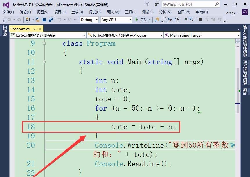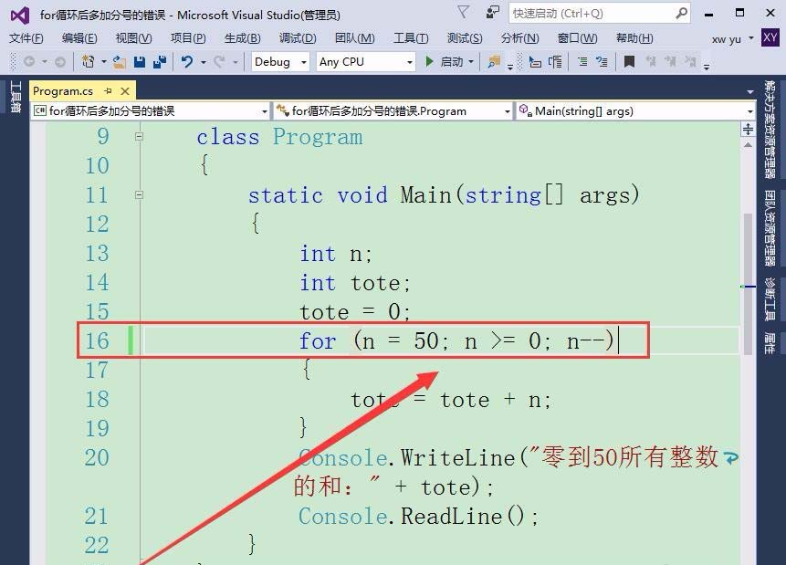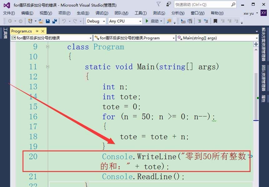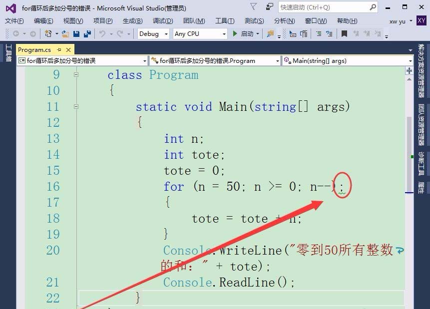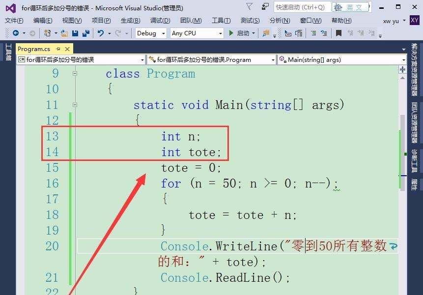 1、如果在for循環后,添加一個分號會有什么樣的錯誤呢?首先,定義一個整型變量n和tote,保存各整數以及總和。