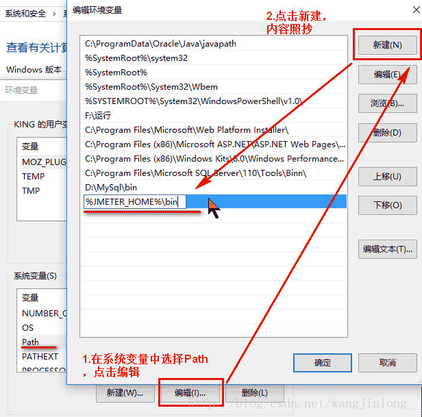 ③ 在系統(tǒng)變量中,找到path,點(diǎn)擊編輯→→點(diǎn)擊新建 內(nèi)容照抄:%JMETER_HOME%/bin
