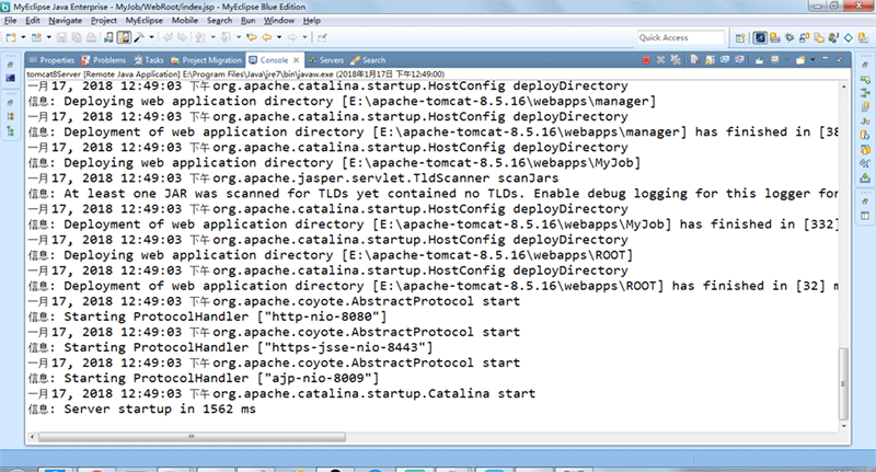 6、點擊啟動,在Console控制臺就會開始打印啟動信息,當你看啟動過程中沒有出現錯誤,而又看這個信息: Server startup in 1562 ms,這代表啟動完成了