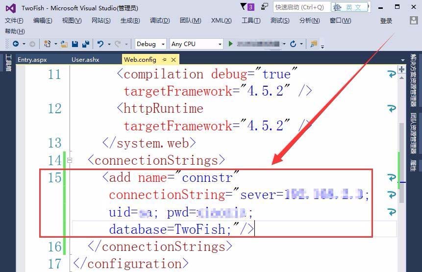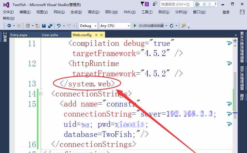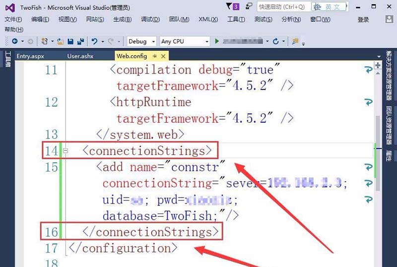 4、首先,輸入connectionStrings標簽,用來輸入配置數據庫連接的代碼。