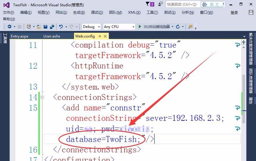 9、最后,用database設置網站的數據庫名,本例的數據庫為TwoFish。