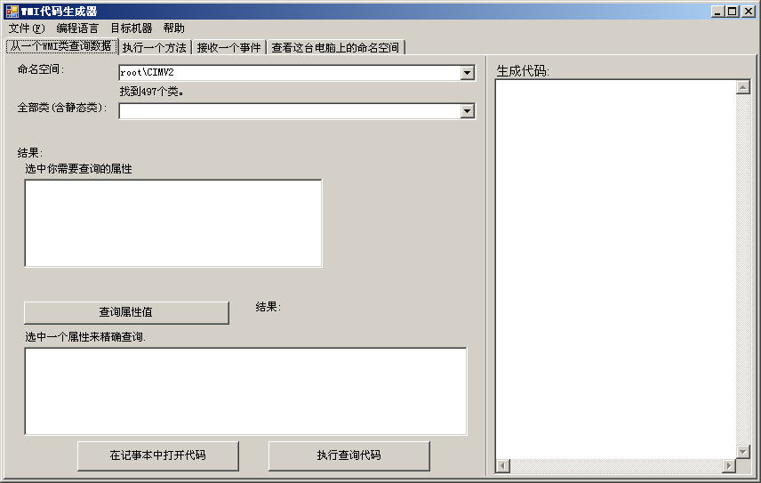 利用WMI代碼生成器可以執行查詢或者執行一個方法等,還可以查看當前或者遠程電腦上的命名空間以及其下的類,并且還可以生成相關的代碼(不然就不叫WMI代碼生成器了),支持生成的代碼類型包括VBS、C#及VB.NET,默認生成的代碼是VBS。