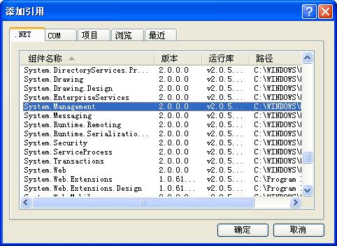 在實際編程中需要注意,System.Management 命名空間中的類都存在于System.Management .dll這個文件中,所以在編程的時候一定要添加對這個dll文件的引用,如下圖: