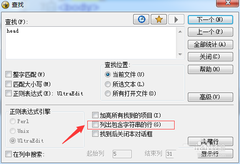 4、這樣就會彈出了查找的窗口中,進(jìn)行勾選上 列出包含字符串的行 的選項。