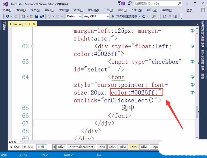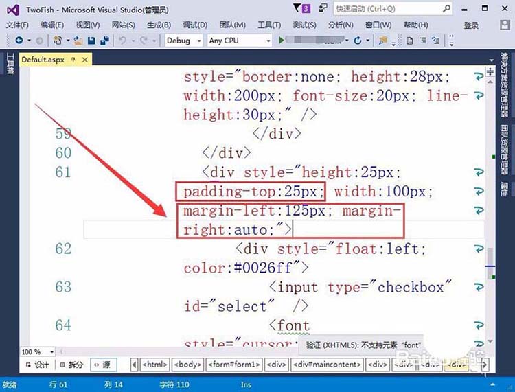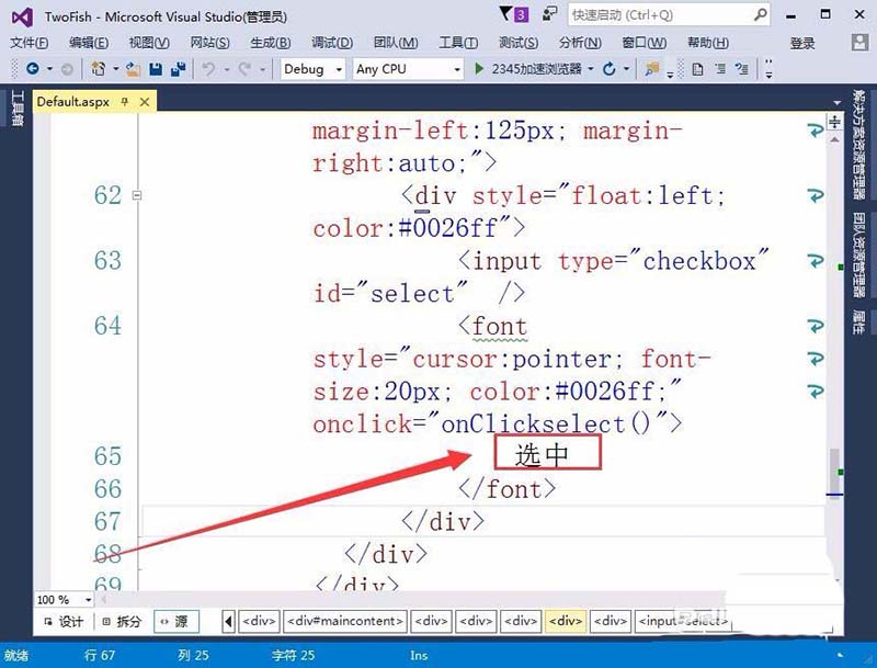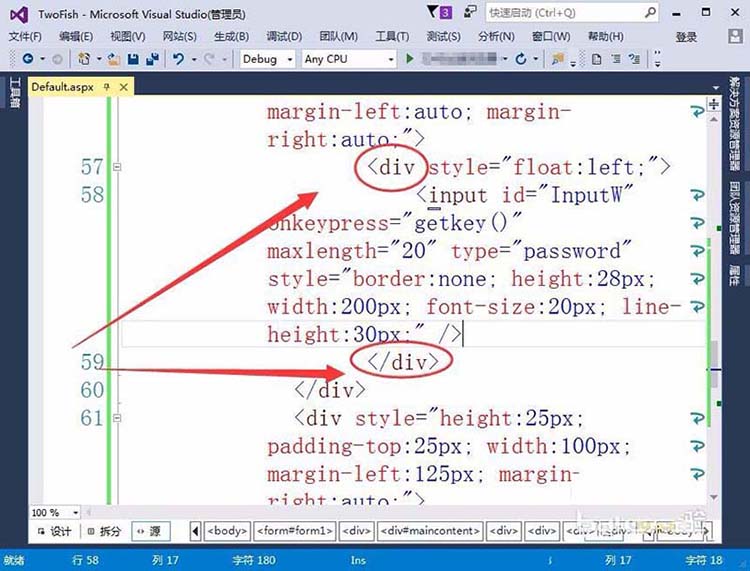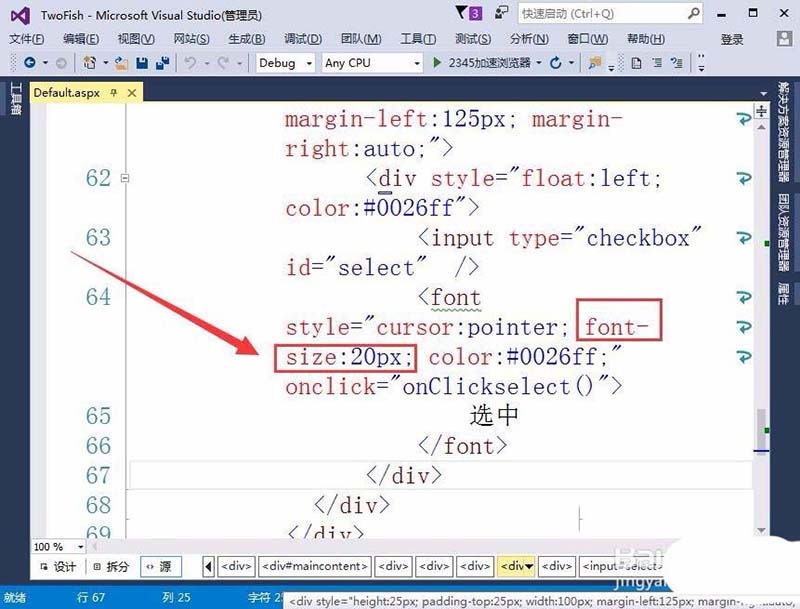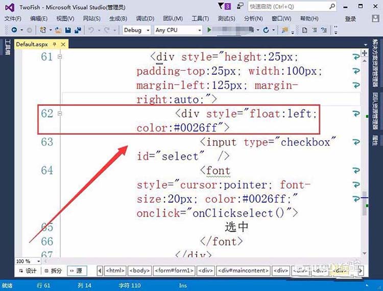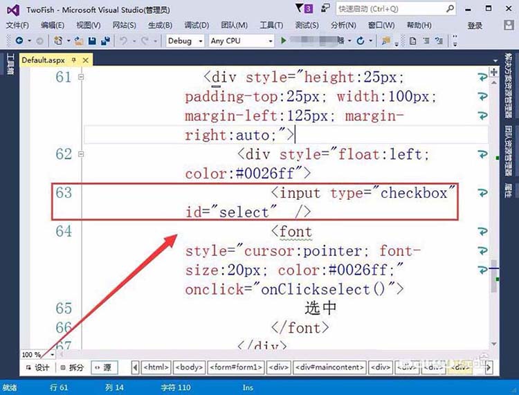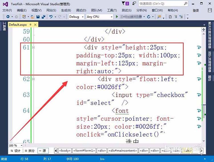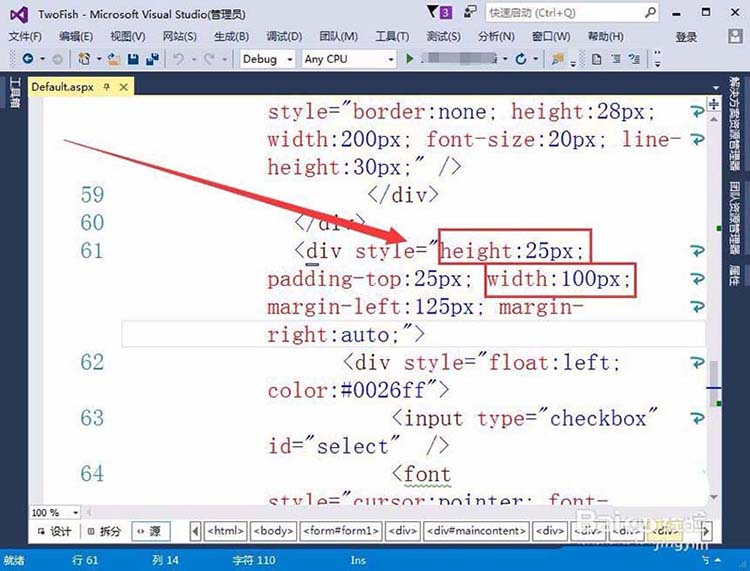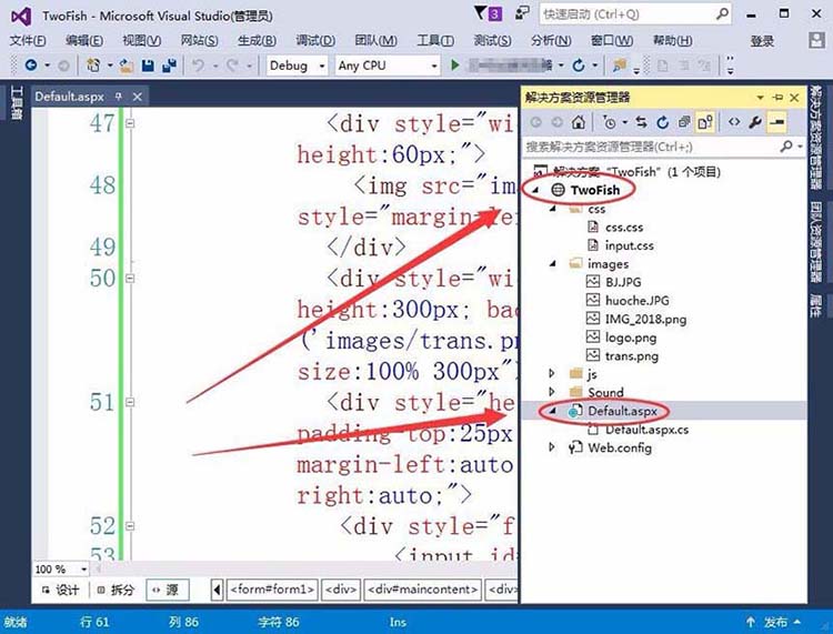 1、用Visual Studio打開(kāi)一個(gè)已有的網(wǎng)頁(yè),本例為TwoFish網(wǎng)站中的Default.aspx網(wǎng)頁(yè)。
