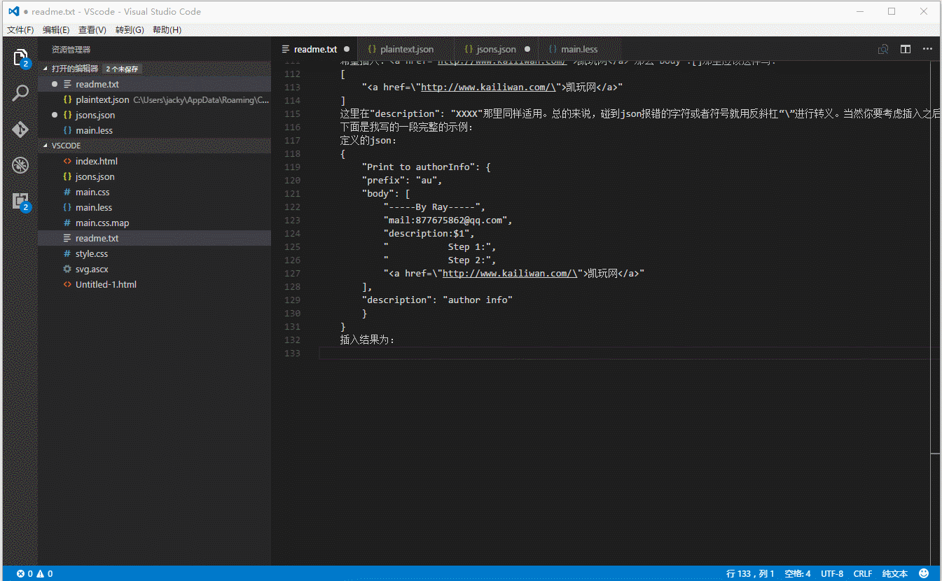 1.文件——>首選項——>用戶代碼片段