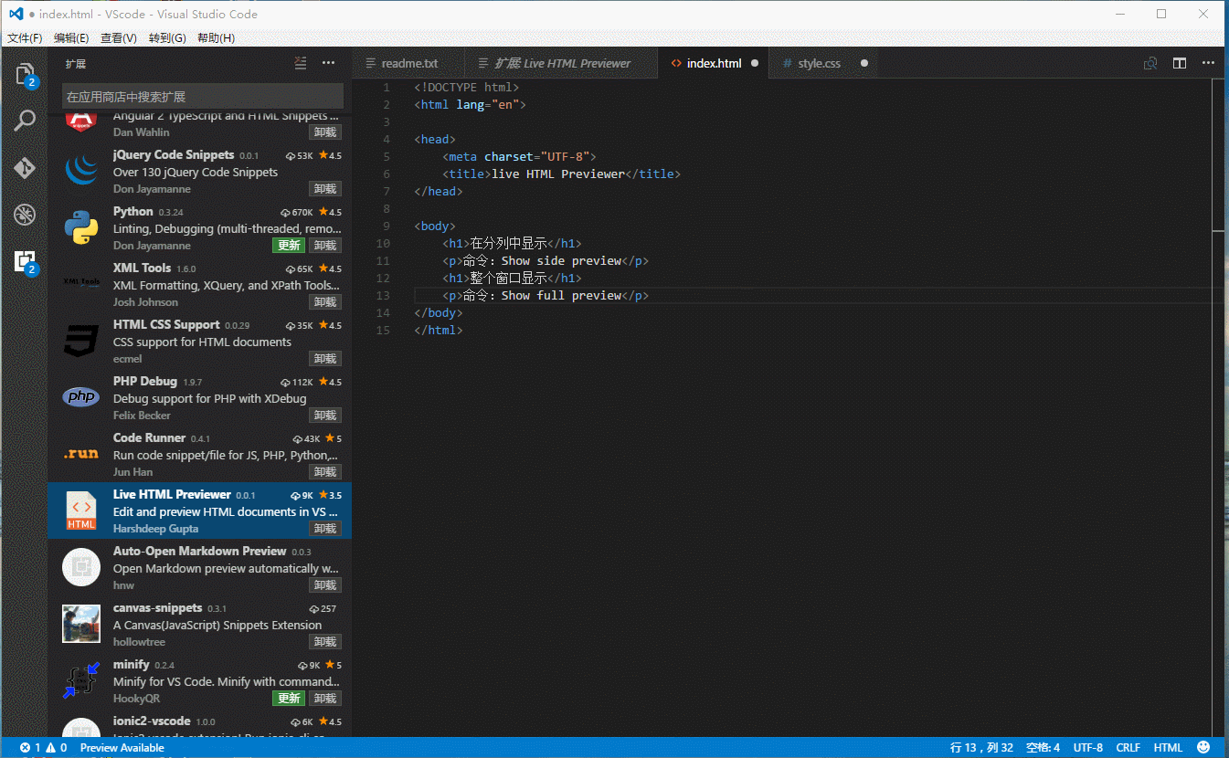 a. 按F1在命令框中輸入:Show side preview 新增一列顯示html,能邊寫邊看到效果,實時預(yù)覽。