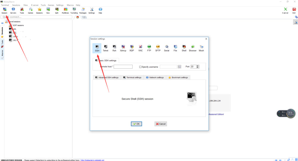 點(diǎn)擊左上角的Session新建一個(gè)會(huì)話,在會(huì)話對(duì)話框中點(diǎn)擊SSH,切換到SSH參數(shù)頁。remote host填寫遠(yuǎn)端服務(wù)器的地址,Specify username填寫用戶名,port填寫端口,點(diǎn)擊OK就可以登錄到遠(yuǎn)端服務(wù)器了。